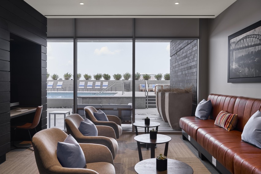 The 860,000-sq. ft. complex offers 313 apartments, including studio, one-, two-, and three-bedroom units and top-floor penthouses. The new apartments feature gourmet kitchens and spacious floor plans. Apartment residents have access to a sky lounge on the 26th floor, as well as a variety of luxury amenities, including a fitness center, an indoor-outdoor club lounge with a professional kitchen, indoor and outdoor pools, fire pits, barbeque grills, a dog park, a dog wash, and a 24/7 concierge. 1200 Broadway is LEED Silver® certified.