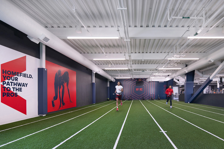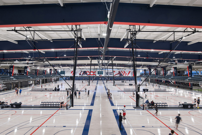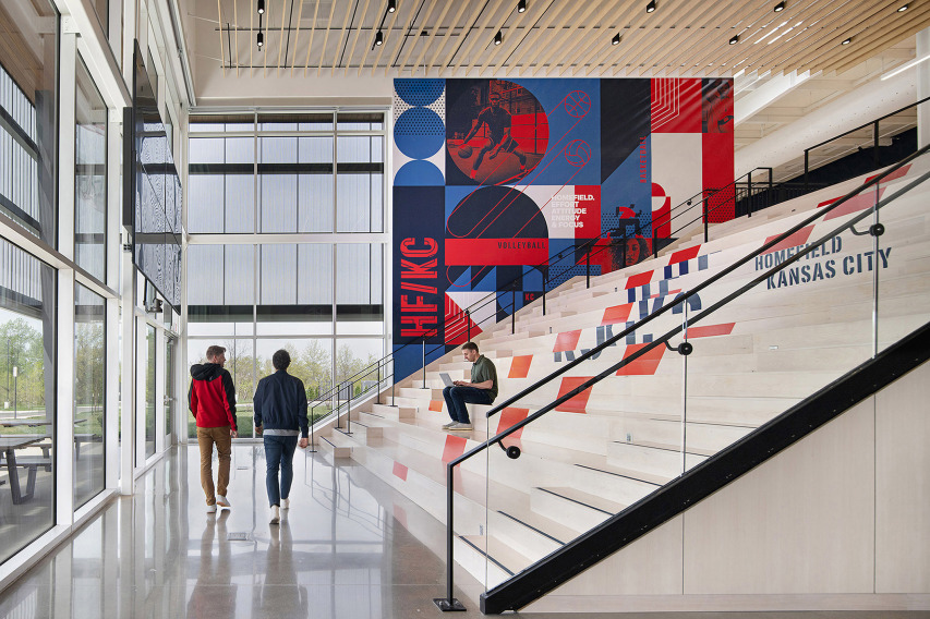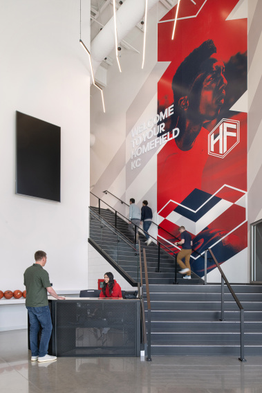 The Homefield Sports Complex in Kansas City, KS, is a one-of-a-kind, 153,000 sq. ft. indoor multi-sport venue featuring 10 basketball courts that are convertible into volleyball courts. The first floor of this building is equipped with an extensive lobby learning stair and sports tunnel, coffee shop, fuel bar and lounge, speed strength and agility, and physical therapy area. The Mezzanine level includes a full kitchen, additional lounges, concessions kiosks, and stadium style fixed seating. This structure is a pre-engineered metal building (PEMB) with a structural steel mezzanine and exterior balcony.