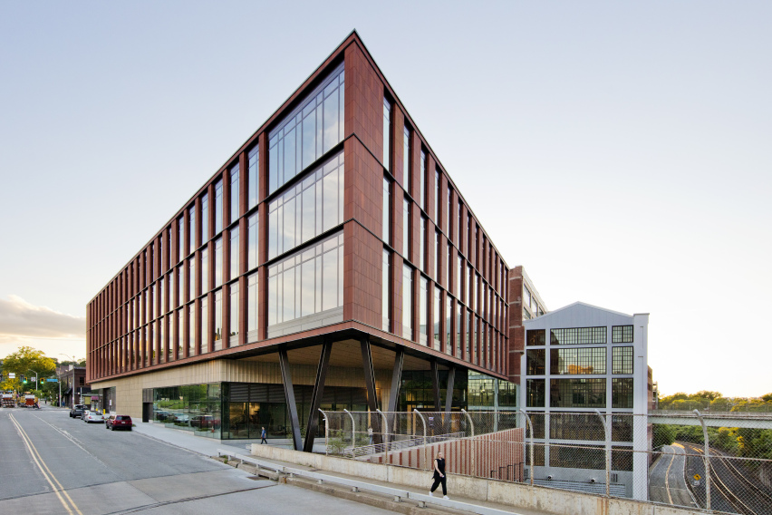 The design for this facility has sensitively restored and preserved the original character of the 207,000 sq. ft., eight-story Ford Motor Building while establishing a distinct, yet architecturally respectful 157,170 sq. ft. laboratory-tower addition and 325-car parking facility. Clad in precast terracotta, the new addition complements, but does not copy, the materiality of the Ford Motor Building. The design inserts a green terrace between the Ford Motor Building and the new tower to further demarcate the old and new structures.