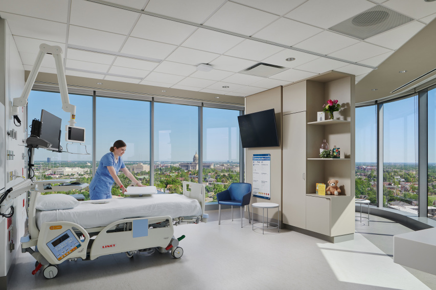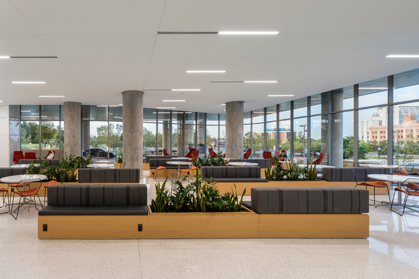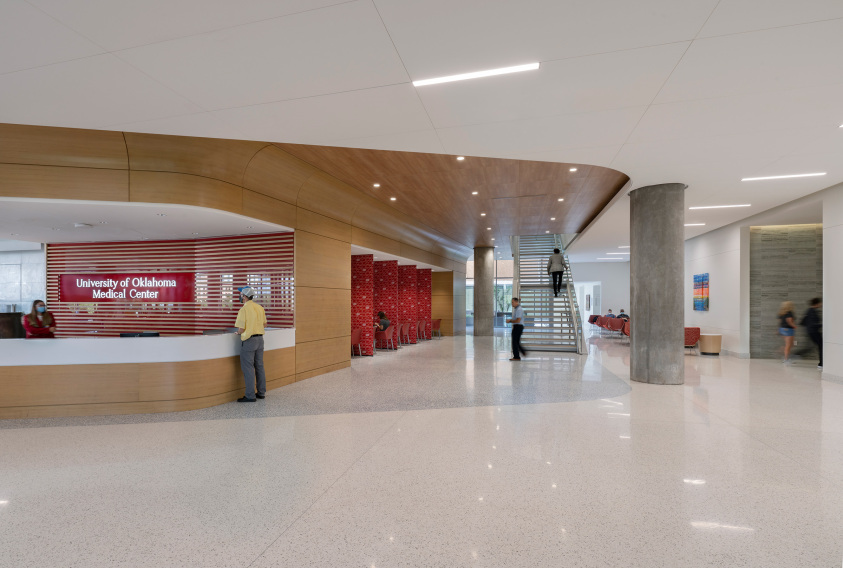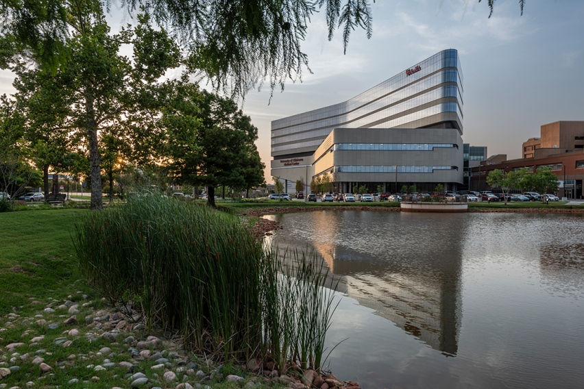 The new facility reflects the ongoing transformation of Oklahoma’s flagship comprehensive academic health system and its mission to provide services that Oklahomans need to achieve health. More noticeable to patients are the oversized rooms with extra space for families. All patient rooms have floor-to-ceiling windows that let in natural light, and because all rooms are on an outside wall, patients and families will have views of downtown Oklahoma City, the State Capitol, and the OU Health Center campus. Nature was introduced in various ways, including natural elements in the design, a healing garden on the fourth floor, and a courtyard garden on the first floor. The design of the new tower, created by architecture firm Perkins & Will, was inspired by the Gloss Mountains northwest of Oklahoma City, a series of mesas and buttes where gypsum sparkles on the slopes. Some of the project goals included building a world-class, high-performance facility in combination with aspirational design goals and introducing forward-looking, modern sensibilities that complement the existing campus.